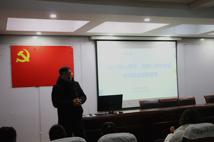 本网讯(教科院 王道阳)2019年2月27日下午,心理学专业在公司学术交流中心举行了心理学研究生考研复试的辅导报告会。报告会由专业负责人王道阳老师主讲,辅导员莫大贡老师以及2015级心理学/应用心理学考生参加了报告会。