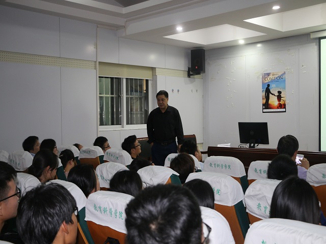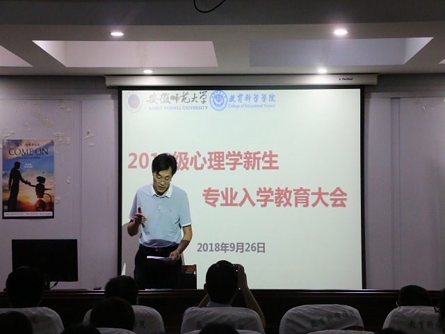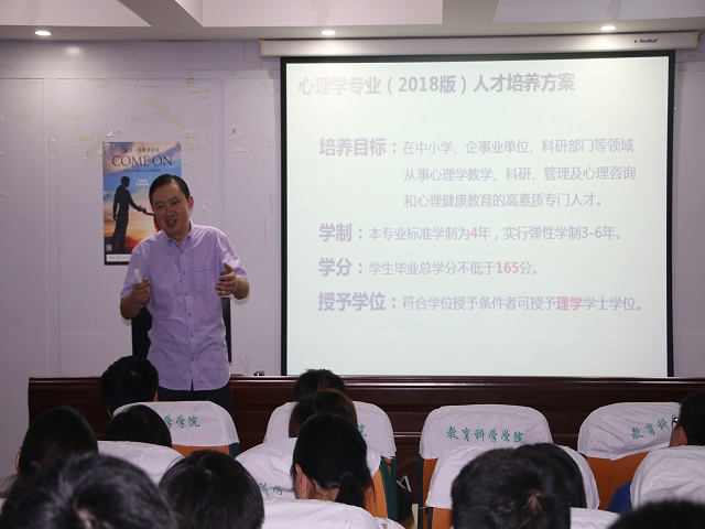 葛明贵教授为2018级心理学新生详细讲述了公司心理学专业的发展史。正如心理科学的历史一样“有着漫长的过去,却有着短暂的历史”,公司心理学的相关课程早在公司建立之初就已经设立,一直到1994年开始招收心理学专业的专科生,后面几经波折才有了今天心理学本、硕、博全层次人才培养的新格局。通过公司心理学专业历程,葛教授勉励2018级心理学新生积极投身心理科学的学习,在心理学科发展历史中留下自己的印记。随后,方双虎教授向2018级新生解读了心理学专业(2018)人才培养方案,介绍了具体课程分布以及学科基础课程的设置等。方教授现身说法,以自身事例督促2018级心理学新生在大学期间要努力学习,莫负时光。会议最后,桂守才教授简单的介绍了教科院心理学实验的相关情况。