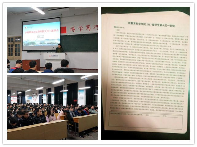 辅导员谭茹轩从学期总结、离校注意事项、寒假安排、返校事宜、重缓考要求等方面进行详细解读。着重强调假期安全问题,要求每位同学返乡后报告平安,提醒同学们注意假期往返途中及在家期间的交通及人身财物安全。为丰富假期生活,谭老师分别布置了读书、绘画、实践等结合各专业特色的寒假作业。并且鼓励同学们积极参与社会实践活动,充分利用宝贵的长假,查找不足,认真总结过去一学期的不足,并做好下学期计划。最后谭老师提前预祝同学们新春快乐,并将精心准备的《致员工家长的一封信》分发下去,叮嘱同学们回家后务必将信交给父母过目,目的是让家长深入了解孩子这一学期的在校情况,帮助促进每位员工成长成才。
