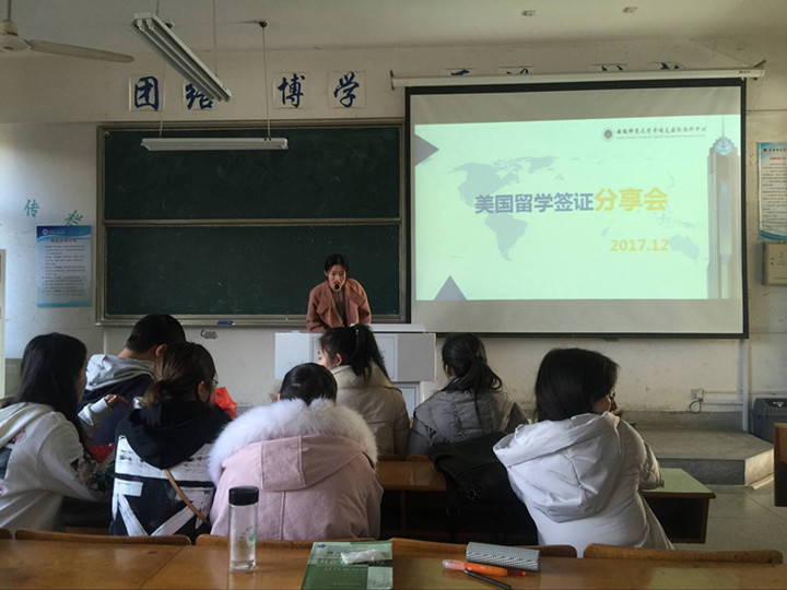 本网讯(教科院 张莺莺)时光荏苒,2016级学前中美的孩子即将踏上赴美学习之路,为做好赴美前的服务工作,12月21日中午,校卡迪夫国际预科中心朱芮老师来到8101与16学前中美的同学就如何办理赴美签证进行了交流。该专业负责人赵学菊及辅导员马兴参加了此次交流会。