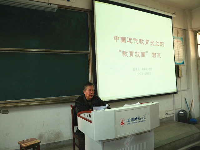 周老师高度赞扬了这些前辈们对国家教育事业做出的卓越贡献。他本人也为中国教育事业付出了很多:抗美援朝时期在战场上坚持扫盲,捐献先父留下的珍贵文献影像资料。他鼓励同学们向为祖国教育事业奉献的前辈学习,珍惜来之不易的学习机会,为中国未来的教育事业贡献出自己的力量。