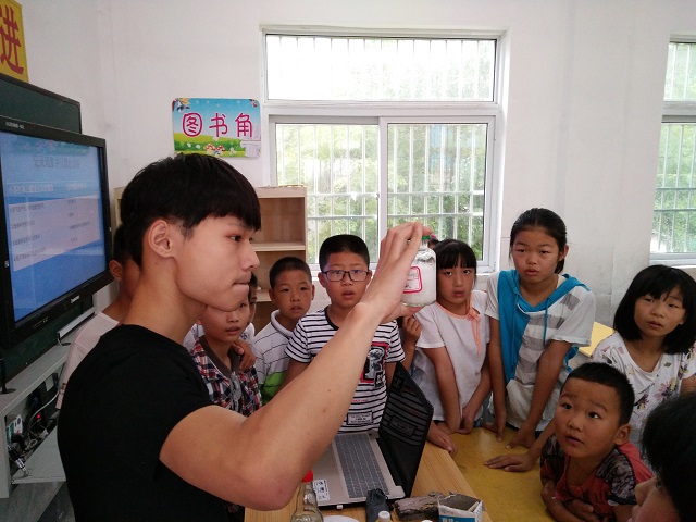 为激发孩子们对自然科学的兴趣与热爱,培养其科学精神, 7月3日下午,团队成员为松岭小学的员工带去了一堂别开生面的趣味化学实验与生活知识课,从化学材料的生活用途常识讲起,到化学实验的操作步骤、注意事项、实验效果与鉴定,再到实际的实验演示。孩子们目不转睛地观察,竖起耳朵安静地听着支教者的讲解,兴趣浓烈时甚至凑到讲桌前围成了几层,近距离地观看着,等演示完毕时便回味无穷地有序坐回座位上。从孩子的目光中,团队成员看到得是他们难掩的惊奇。