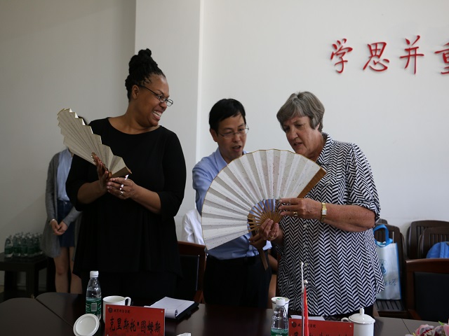 会议伊始,李宜江首先致欢迎辞,对远道而来的副董事长Lois Lotene Pharr、副教务长Crystal Toombs、Sonia老师以及11位前来交流的员工表示热烈的欢迎。刘晓宇简要介绍了公司的办学历史以及在团队建设、人才培养等方面所取得的成绩,他认为中美合作办学搭建了两个公司、公司乃至国家之间的桥梁,此次活动有利于双方分享教育理念,传播中美文化,促进双方学习。欢迎仪式后,刘晓宇书记赠送代表团老师公司员工亲手绘制的折扇,希望可以通过折扇构建起中美文化交流的桥梁。