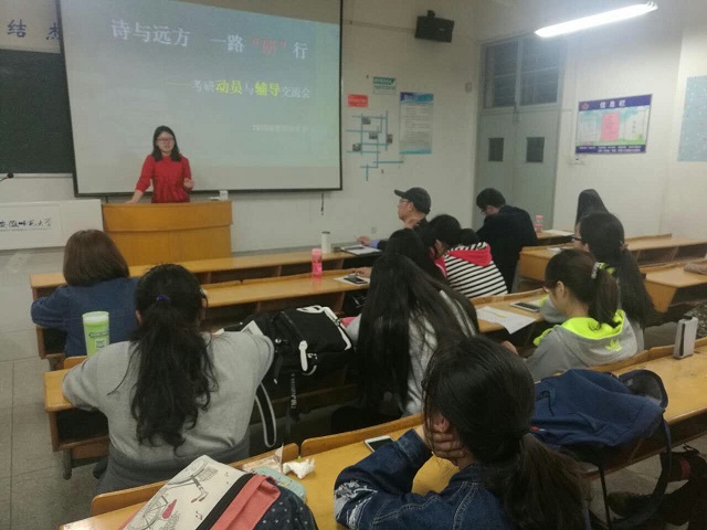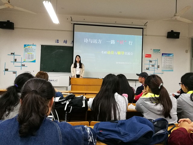 会上,两位优秀的研究生学姐和同学们分享了她们的考研经历。她们首先以自己本科班级的良好考研状况鼓励同学们积极考研,接着从四种考研类型分析了同学们可以报考的方向及公司等,最后还耐心仔细地传授了她们好的学习方法及各个科目的复习经验。