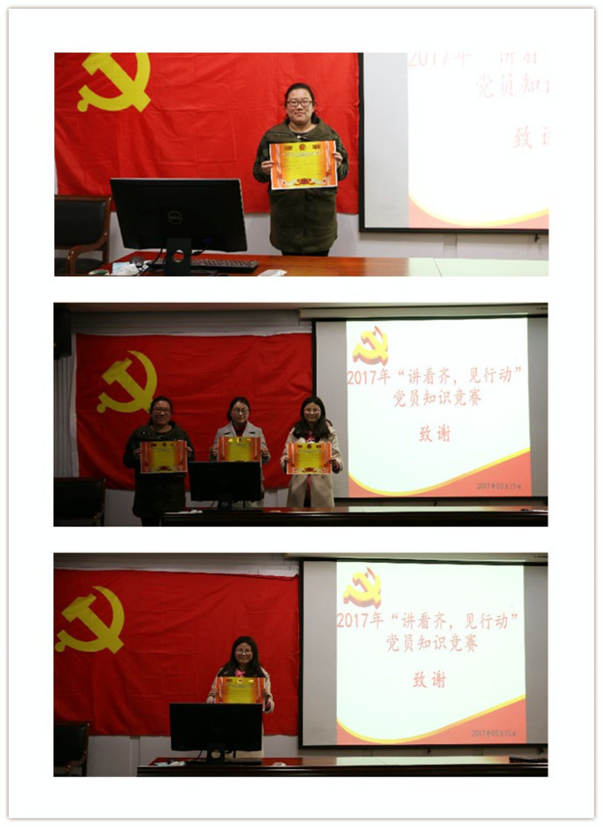 紧张的竞赛活动一共分为三个环节:必答题环节、抢答题环节、风险题环节。必答题环节中,一共有54题可供参赛的6组同学选择。内容是关于党的制度、性质、纲领、历史等方面的知识,范围广泛而全面。参赛的党员、积极分子对党的理论知识都做好了充分的准备,54道题中仅仅有两道题回答错误,比分并未拉开差距。紧接着,激动人心的抢答题环节拉开帷幕,6组分别派出一个成员作为代表参与抢答。每当“开始抢答”的“答”字刚一落地,6位代表纷纷争先恐后的站了起来进行抢答。在这一环节中,沈竞成同学表现非常突出,一个人抢答了三道题,而且全部回答正确,赢得在场观众阵阵掌声。第三个环节:风险题环节。这也是本次知识竞赛最令人紧张的一个环节,在本环节中回答错误要进行扣分。各小组都十分谨慎而又积极地选择不同难度的题目进行回答。其中,方兵同学回答了问题“党中央为什么要在全党召开两学一做学习教育”,方兵同学流利的、几乎一字不差的回答了出来,观众纷纷鼓掌。纪平平同学则是以连答了两个20分的风险题题,表现突出。比赛的最后,研究生辅导员曹晓芹给各个获奖的小组和各位获得个人奖的同学发放了奖状和奖品作为纪念。