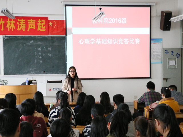 本网讯 (教科院 文\鲍旭婷 图张启山)为了提升员工专业兴趣,夯实心理学基础,3月27日下午,2016级心理学和应用心理学共70余名同学在田楼8410举办了首届普通心理学基础知识竞赛,辅导员朱雨雁参加指导。