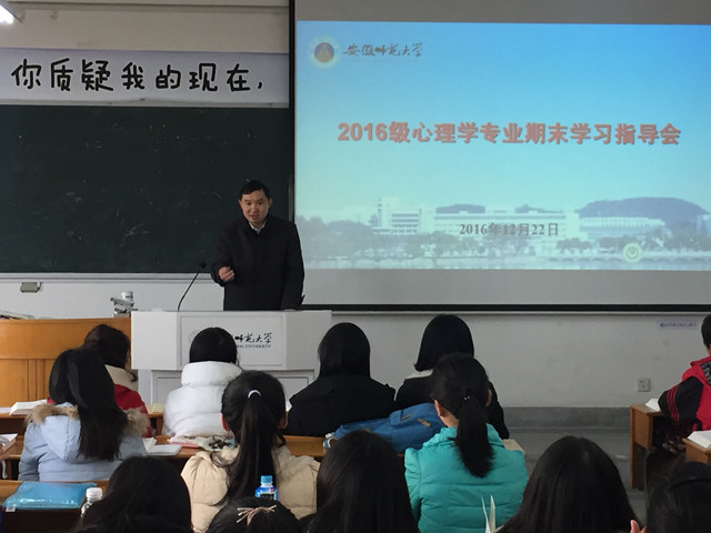 心理学专业负责人方双虎老师从三个方面来进行指导。首先,他提出同学们要学会科学学习和复习,以及如何复习迎考和各学科在考试中应注意的问题,其次,方双虎对同学们期末考前复习做了详细安排。他希望同学们考前收回心思,用有效的方法进行高效率的复习。其次,着重强调考风考纪问题,希望同学们自觉遵守校规校纪,诚信应考。最后,从我国未来心理学的发展向同学们描绘了美好的心理学前景,进一步巩固了同学们的专业思想。
