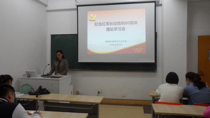 会上,童张梦子带领全体党员认真研读了习近平总书记关于纪念长征胜利80周年重要讲话,并观看了相关新闻视频。图文并茂的学习形式,丰富的学习内容,让在座的党员同学深有感触。随小莉同学积极主动地分享了自己的所思所想,“艰苦卓绝的长征路是我们民族的骄傲,伟大的长征精神是我们学习的好范例。研三的我们,正有一段‘艰难的论文写作路’要走,这好比一段长征,需要我们的坚持与付出。”位涛同学从自己的幸福生活说起,感慨如今幸福的来之不易,希望可以不忘初心,珍惜时光。聂余同学联系毕业班就业实际认为“找工作也是一段小小的‘长征路’,我们一定要不急不躁,认真走完并走好这段路。”过婴宝老师别具特色地为同学们讲述了英雄先烈的小故事,在鲜活的革命先烈事迹中,同学们再一次深刻领会了长征精神的价值意义。大家踊跃发言,诉说着每个人的心声,认识到纪念长征,缅怀先烈,一代人有一代人的使命,我们这一代更有自己的长征路要走。小到个人,大到国家,只有不忘初心,才能取得胜利!