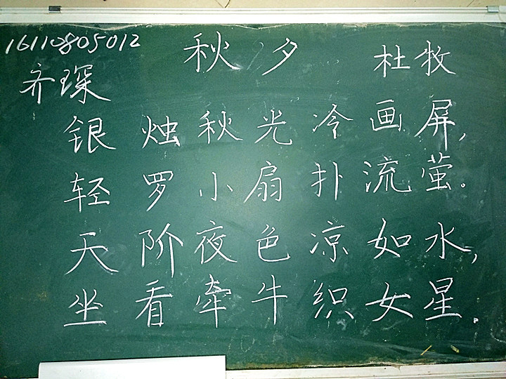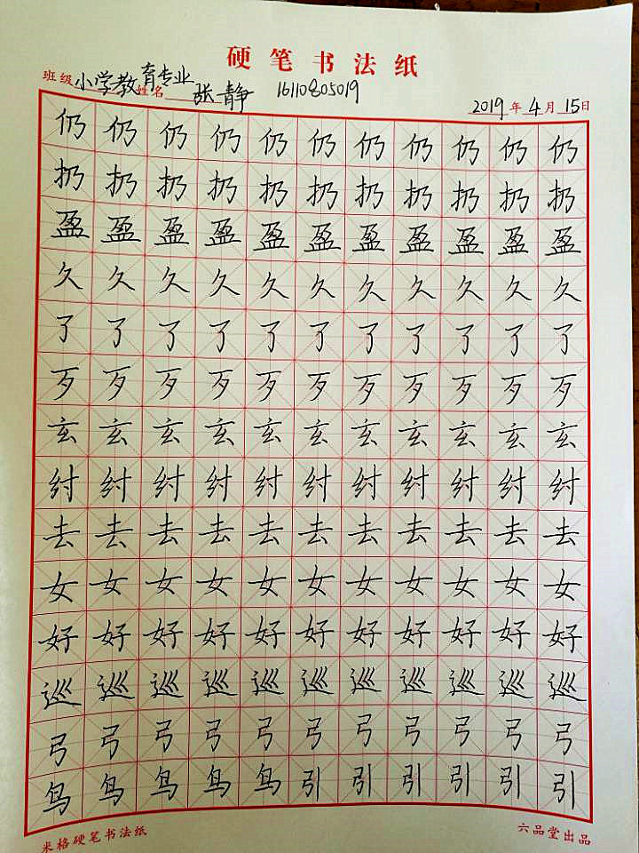 “书法有教室,写字无专时,提笔即练字,贵在能坚持。”书法作为中华优秀传统文化之一,可以培养员工欣赏美、追求美、创造美的品格。为扎实锻炼同学们板书的基本功,进一步提升师范生的专业技能,16级小学教育专业本持续开展“书法周周练”,形成了独具特色的书法交流系列活动。“不积跬步无以至千里,不积小流无以成江海。”书法练习只有进行时没有完成时。从入学开始,“周周练”在书法老师的专业指导下以同学们一周写硬笔字,一周写粉笔字,每两周公布一次评分的形式进行。此外,16级小学教育专业联合17、18级本专业同学成立书法评定协会,活动期间每一次评分都遵循互相交换同学作业照片的原则,硬笔字和粉笔字的平均分即为最终成绩。通过较长时间的训练,不仅培养了同学们的书法兴趣和爱好,书法及板书的书写水平也得到一定提高。专业负责人王老师对同学们提出相关建议,她指出钢笔字和板书的练习贵在坚持,写得一手好字非一朝一夕之功,须得静心静气、慢慢雕琢,全体同学应当勤勉对待,以增进自己的专业技能。同学们也纷纷表示要天天练字,使自己的书写水平更上一个新台阶。据悉,小学教育专业将于五月中旬开展院内书法比赛。届时表现优异的同学会得到一定奖励,期待同学们的精彩表现。