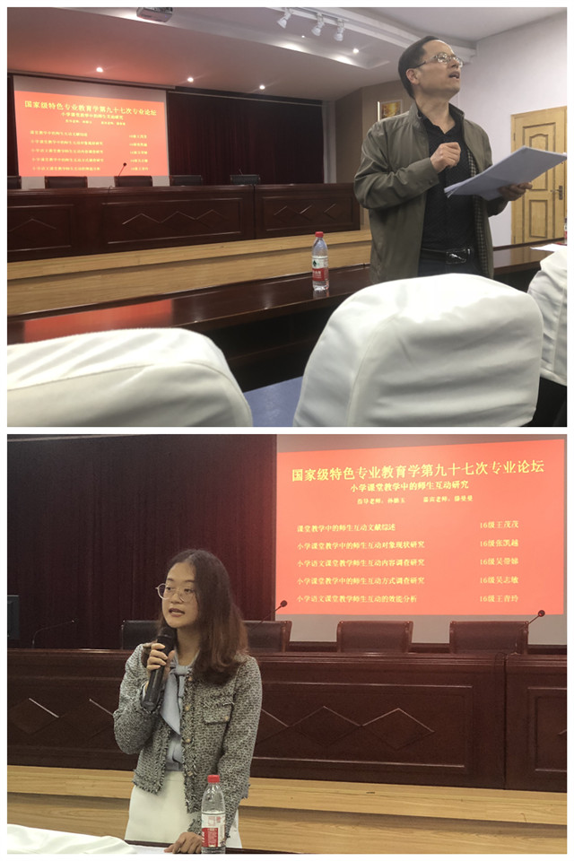 在激烈的集体讨论环节,台下同学们踊跃发言,通过对文章的结构、内容和个别观点等方面的详细分析,向汇报同学抛出一个又一个精彩提问。在导师点评环节,滕曼曼老师从学术规范、研究方法的科学性、本小组的研究内容三个方面进行了点评与指导。她认为,研究综述应具有三个任务,分别是展示选题的价值、体现研究的切入点和寻找可以借鉴的方法路线;其次,要点明分析的方法,并且合理运用软件获取的结果;此外,滕老师针对每位同学的文章进行了鞭辟入里的具体指导,使同学们对学术研究有了更深入的理解。孙德玉老师表扬了小组同学们本次汇报的进步之处,对专业论坛这一课程也再次进行了充分肯定。他强调,严谨的作风是学术研究的重要保障。其中,规范的格式,准确的标题、摘要和注释是一篇合格文章的前提和关键;随后,孙老师具体指出,该小组研究的师生互动概念界定还不够清晰准确,小组成员所采取的定义也不够统一,概念界定应当做到一以贯之、科学合理;最后,老师对每位小组成员的文章也进行了一一点评,同学们也在两位老师的指导中,更加明确了作为教育学专业的员工应当具备的学术修养。