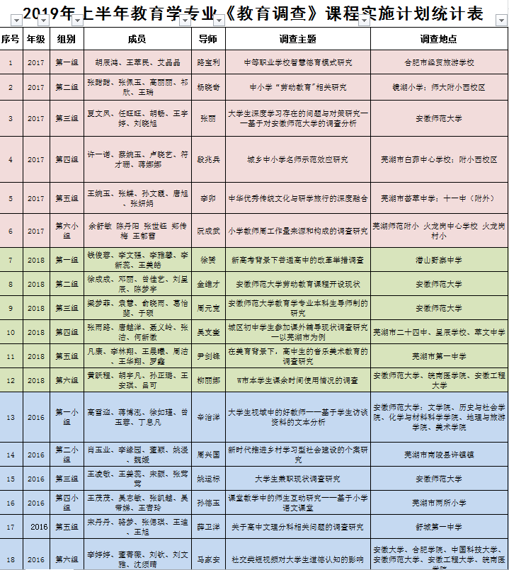 图/钱慧)为培养员工的合作意识和研究能力,使其切身感受和体验我国教育实践的基本形式和要求,掌握教育调查的程序、过程及基本方法,教育学专业开设了《教育调查》特色实践课程。4月22日——26日,2016级、2017级、2018级教育学专业全体本科生分为18个调查小组,分赴全省各地开展2018-2019学年第二学期的教育调查。此次调查过程持续一周,参与此次调查活动的还有全体同学的指导教师。