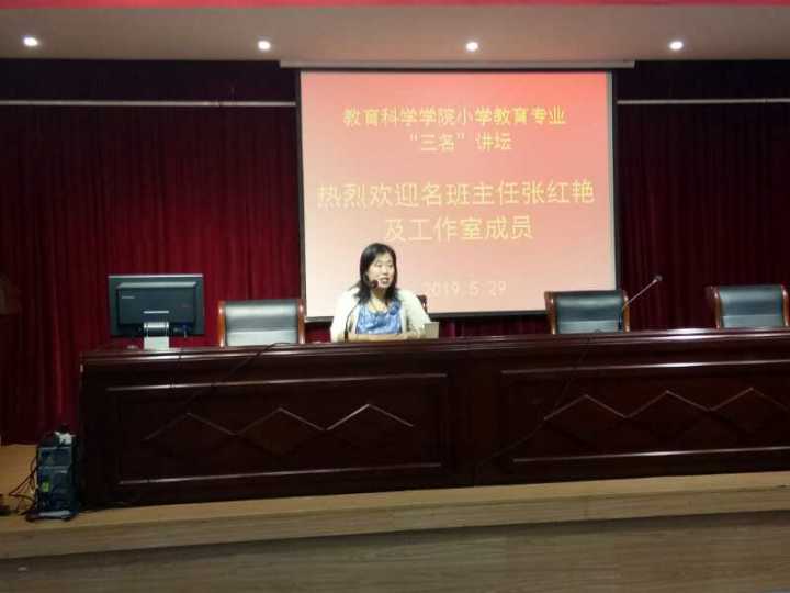 本网讯 (教科院 王利群) 5月29日, 安徽省特级教师、教学名师,狮子山小学张红艳老师做客“三名”讲坛,给公司小学教育专业全体同学开展了一场精彩的讲座。讲座由专业负责人王芳老师主持,小学教育专业全体同学参加了此次讲座。
