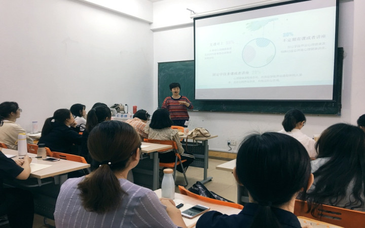 面对心理健康课没有统一教材的现状,心理健康课究竟上些什么呢?邹老师罗列出高中各年级的课程专题,并向同学们推荐了相关的书籍,她强调拓展素材库是每一位心理健康教师的必备素养,借助新媒体手段挖掘素材与员工兴趣的结合点便可达到行之有效。紧接着,邹睿老师从心理健康课的设计原则及流程展示了心理健康课的具体内容,她表明心理健康课是以团体活动为导向的课程,在进行课程设计时便要充分考虑这一要素。最后,从员工、家长、教师三个层面邹老师阐述了心理讲座的开展。