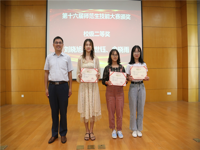 在确定了参赛选手的名单后,同学们在徐赟老师的带领下进入了紧张的训练环节。参赛选手们在徐赟老师指导下和同学们的建议下,一遍又一遍地打磨自己的授课环节,不断地改善自己的教态。训练期间还邀请李卯老师给予指导。最终在9月21日校级第十六届师范生教学技能大赛时,在13个院64名参赛选手中仍然得到了评委老师们的肯定。参赛选手们准备充分,在即兴讲演环节机智应答,逻辑严密,用自己所学的教学知识作为自己论点的支撑;模拟授课环节教学过程设计合理,语言表达准确生动,教学方法独特新颖。最终祁欣同学荣获校一等奖,张世钰、刘晓旭、俞晓雨同学获得校二等奖。