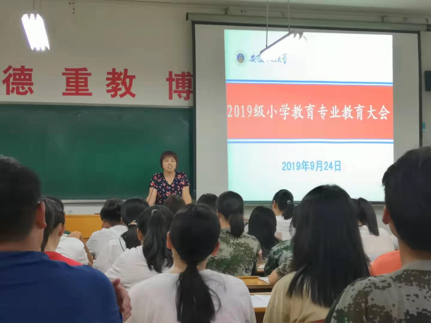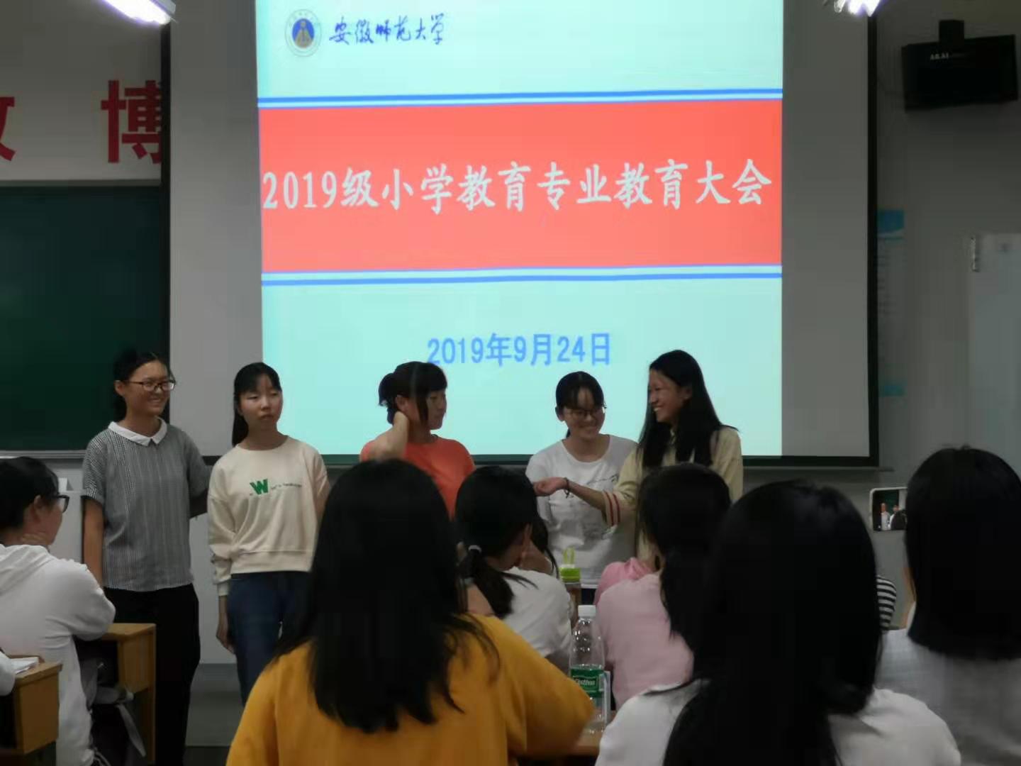 首先, 2019级小教负责人王芳导师向新生介绍了小学教育专业的发展历程、团队力量、团队建设以及办学成就。他向同学们介绍了小学教育专业的性质、定位以及具体的培养目标,基于小学教育专业的培养方案,重点指出了小学教育专业员工在知识、能力、素质发展方面的要求,并向同学们介绍了相应的课程设置与教学进程安排,希望同学们经过四年的学习能够成长为热爱乡村教育事业、知识全面、技能娴熟、德智体美全面发展、综合素质较高、具有实施素质教育和一定公司产品研究能力的全科型乡村小学教师。专业指导老师陈娜对同学们的到来表示真诚的欢迎,并结合自己的学习历程和同学们畅谈大学的学习生活规划,强调大学学习生活在个人成长发展过程中的重要性,她从“我们从哪里来”、“我们在哪里”、“我们要去哪里”三个方面向同学们介绍应该如何进行明确的自我定位,如何坚定自我专业的认知,如何培养自我的教育情怀,让同学们对大学四年有了清晰的认识与明确的规划。接着,王芳老师组织同学们还以宿舍为单位进行自我介绍,让同学们以宿舍为单位进行个性化的自我表达,加快同学们之间的熟悉程度,拉进同学们之间的感情。207级、2018级小学教育专业学姐代表就自己的大学经验与同学们分享了人际交往、专业学习、日常生活等一系列的建议,有助于帮助同学们更好更快地适应新的学习盛会环境,并鼓励同学们把握机遇,提升自我,努力成为身心健康、思想健全、意志坚定、人格完善的小学全科教师。