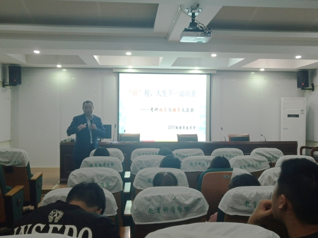 会议由杨滨老师主持,他首先介绍了15级教育技术学专业的考研情况,鼓励大家要建立本专业的考研信心,并期望同学们能够认真听会,对考研有一个正确的认识,并果断做出抉择。接着,刘和海教授综合历年的考研情况进行考研指导。刘和海教授首先指明教育技术学本科同学考研的必要性,并用具体实例说明研究生与本科生在就业方面的区别。随后他指出同学们在考研之前要清楚地思考自己为什么考研,是为了以后就业,还是为了满足兴趣爱好等。还综合以往本科生的考研数据,对于考研择校,专业选择,导师选择,考研后的继续深造等方面做了具体的阐述和指导。最后,他指出考研不易,需要付出巨大的努力,希望同学们把握机会,全力以赴。接下来,杨滨老师特邀15级学长,为在场的员工分享了考研经验,这些学长现分别为上海外国语大学、浙江工业大学、华东师范大学的硕士研究生,其中三位同学为本次指导交流会特意录制了视频,远程分享了关于择校、时间规划、资料选择等宝贵经验。最后,15级教育技术学专业的詹雅玲到现场与同学们进行了经验交流,为17级同学的考研指明了方向。