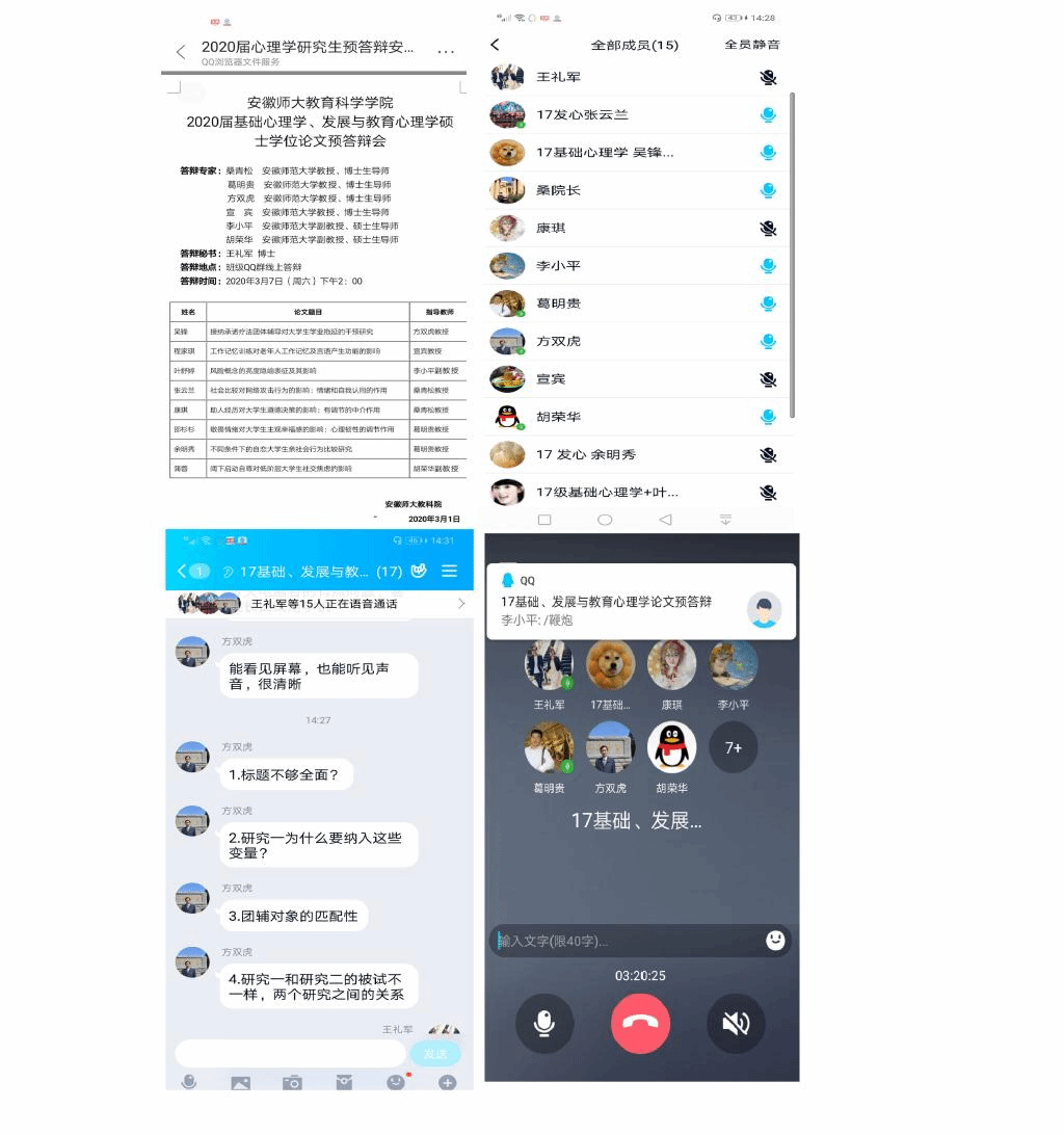 本网讯(余明秀,王礼军/文)在新冠肺炎疫情防控期间,为了使公司心理学2020届毕业研究生进一步完善学位论文、规范论文写作、提升学术水平,公司于3月7日下午举行了心理学硕士学位论文线上答辩会,会议由心理学专业的葛明贵教授主持,桑青松教授、方双虎教授、宣宾教授、胡荣华副教授、李小平副教授以及17级基础心理学和发展与教育心理学专业全体研究生共同参与,王礼军老师为本次线上预答辩的秘书。
