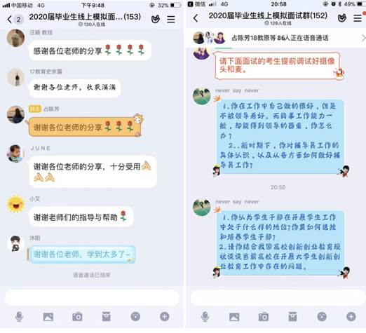 云模拟,明流程。 整个模拟面试活动秉持“仿真面试,缓忧抗压”的原则,分为模拟面试和干货分享两个部分,模拟面试环节重在让硕士毕业生了解辅导员面试考核形式和流程,并通过考官对每位模拟考生的表现点评,让参与者明确自身的优势与薄弱环节;而干货分享环节意在给硕士毕业生指明高校辅导员工作的侧重点和招聘考核注重的素质要求。担任本次模拟面试主考官的是安徽省辅导员名师工作室主持人龚伟老师,曾荣获全省高校就业指导课教学大赛一等奖、安徽省2014年高校辅导员职业技能大赛特等奖。龚老师根据八年的辅导员工作经验提出辅导员考核不仅要展示出个人对政策文件的熟识、必备业务能力的掌握,同时还要在面试中展现出较强的心理素质和人际交往的潜力,辅导员工作的本质就是一门学会如何与员工相处、与自己相处的学问。并从辅导员工作考核的流程和重点、招聘侧重的素质要求、高校在防疫中辅导员的工作实务三个方面作了全面的分析和细致的解读。