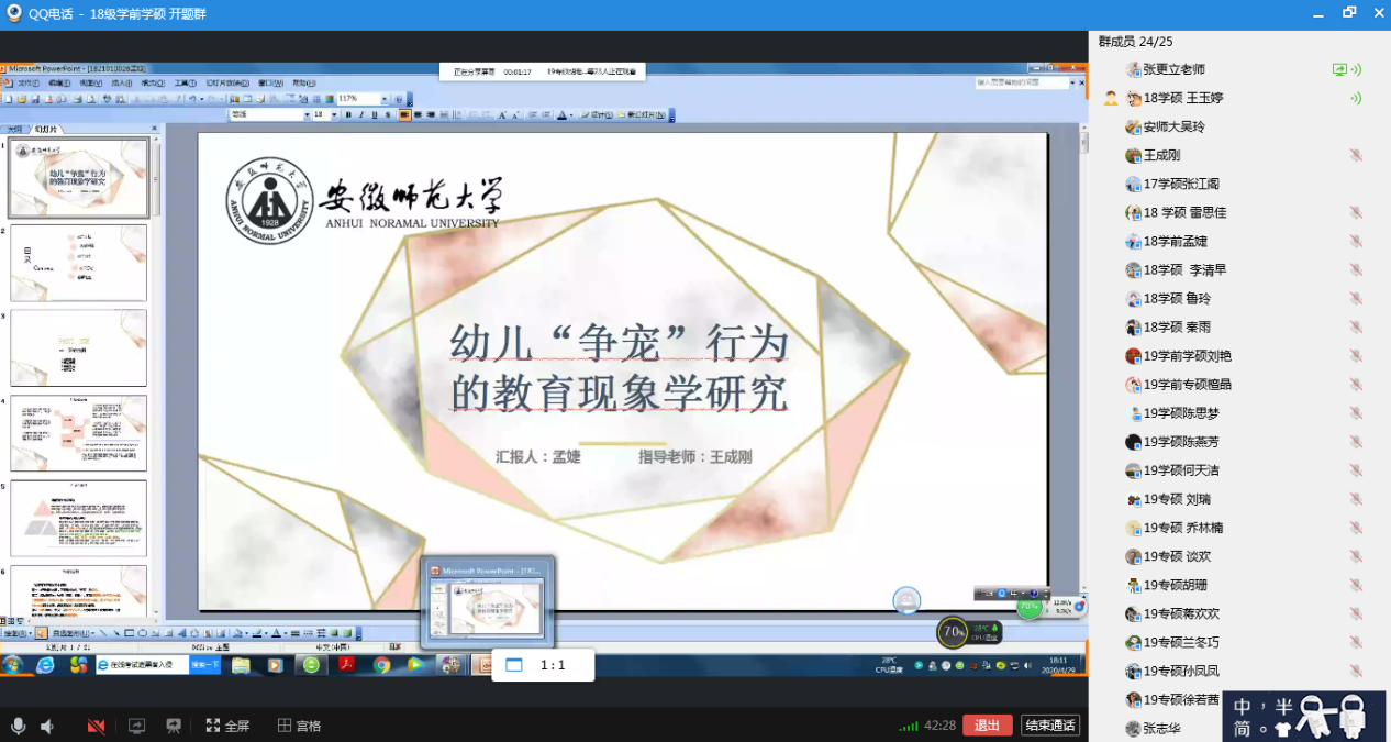 (王玉婷/文图)2020年4月29日(星期三)下午2点半,公司2018级学前教育学硕士研究生举行了研究生学位论文开题答辩会。受疫情影响,此次开题答辩会在线上通过QQ群的方式进行。本次开题指导会议由张更立教授主持,吴玲教授、王成刚副教授、赵学菊副教授和张志华老师参加答辩会。18级学前教育学共7位同学进行开题汇报,19级学前教育学学硕和学前教育专硕研究生加入QQ群旁听学习。