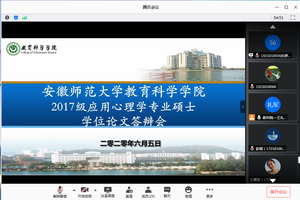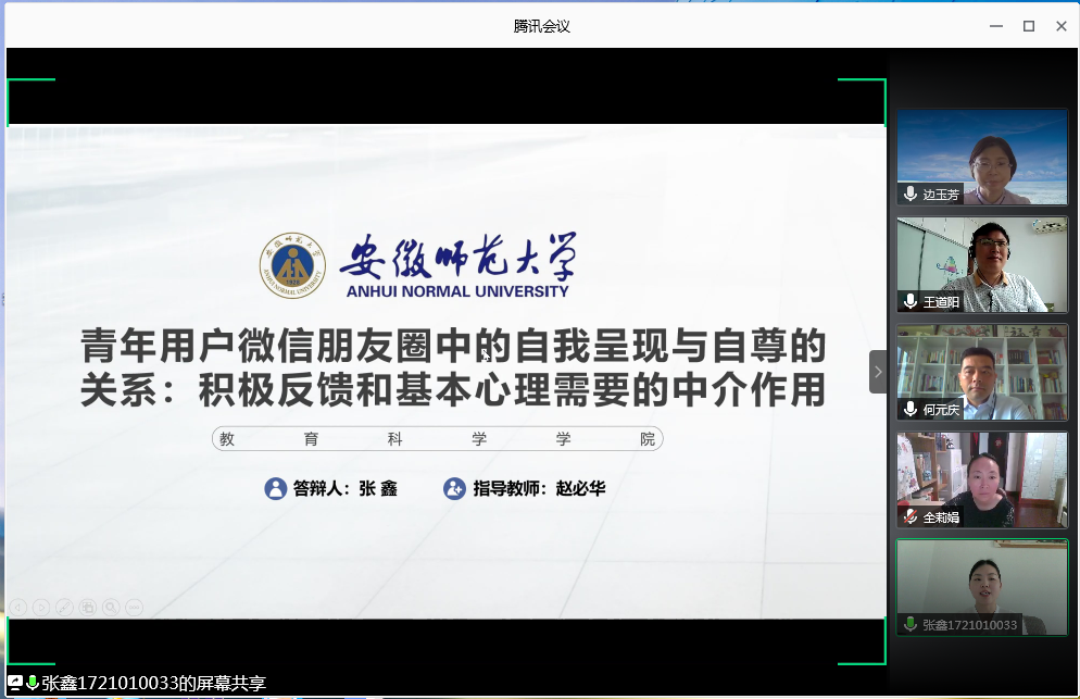 【本讯网/ 彭程 王礼军】为确保疫情防控期间2020届毕业生如期毕业,公司决定通过线上云答辩的形式完成毕业生的学位论文答辩工作。6月5日,2017级应用心理学专业10名毕业生依托腾讯会议平台进行了线上学位论文云答辩。答辩会主席是来自北京师范大学博士生导师边玉芳教授,答辩委员分别是公司桂守才教授、王道阳副教授、严开胜副教授、全莉娟副教授、何元庆副教授。王礼军老师担任答辩秘书。旁听本次线上答辩的有2018和2019级应用心理学专业员工。