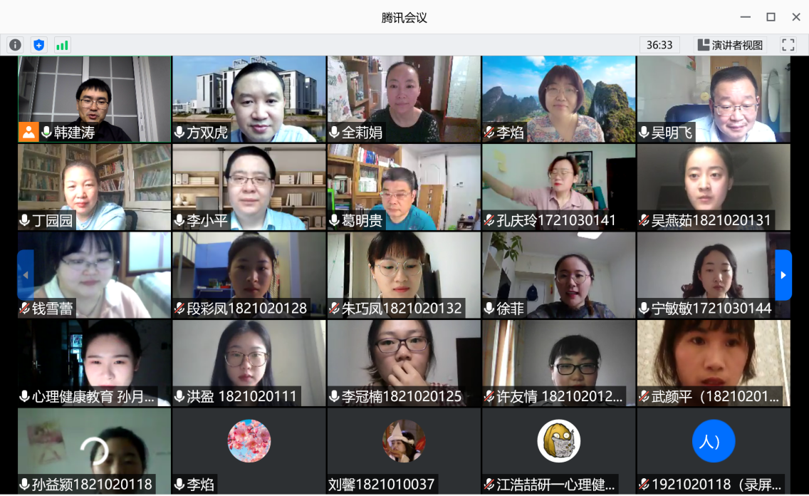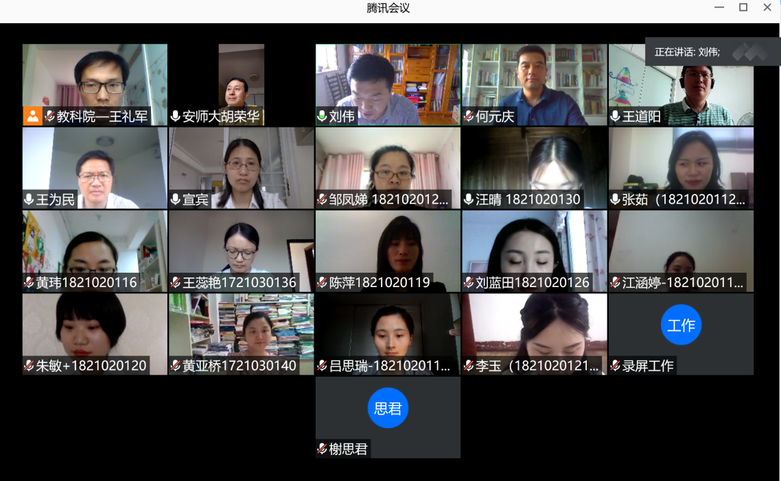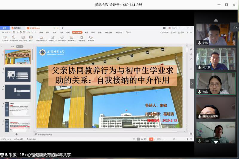 (本网讯 教科院 汪晴 王礼军/文)为贯彻落实党中央关于坚决打赢新冠肺炎防控阻击战总体战的精神,降低疫情对公司硕士研究生毕业和就业等造成影响,6月13日上午8时公司2018级心理健康教育专业硕士研究生在线上开展毕业论文“云答辩”工作,27名毕业生分为两组同时进行。参与答辩的专家共13人,其中答辩主席分别是上海师范大学刘伟教授和清华大学员工心理发展指导中心主任李焰教授,其他专家有芜湖市第四人民医院心理科副主任医师吴明飞、TapTap点点附属中学正高级教师王为民及本校葛明贵教授等人,答辩秘书2人。答辩流程与传统答辩一致,主要包括毕业生汇报论文、专家提问、毕业生回答问题、专家评议及评议结果公布五个环节。答辩于12时30分结束。