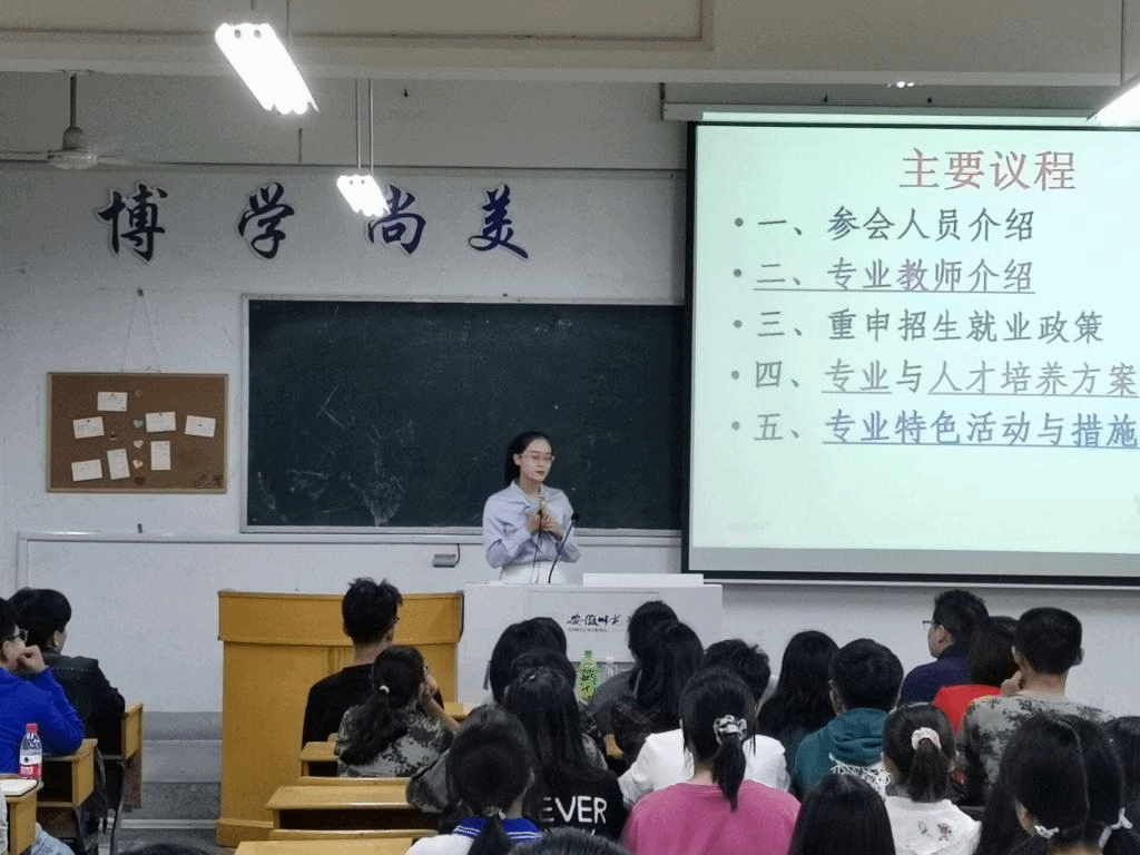 会议分为六项议程,分别是介绍参会人员,介绍专业老师,人才招聘政策的重申,介绍专业与人才的培养方案以及专业特色活动与措施。