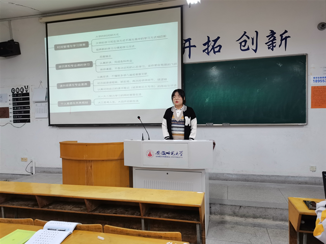 紧接着,同被录取到华师大的陈丹阳基于同学们的学习困惑,从时间管理与学习效率、通识课和专业课、课外阅读与专业素养、个人意愿与未来规划等方面着手,结合自身经历,为大家分享自己独到的学习经验。在提问交流环节中,三位保研学子为新生答疑解惑,详细分享了学习素材、学习方法、学习规划等方面内容。