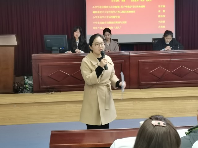 第二位汇报人张慧以《翻转课堂中老员工的学习投入情况调查研究》为题,通过整理研究中外相关文献和对代表性的个例进行访谈,对翻转课堂中教学模式的发展以及关于学习投入的研究进行历史的动态把握,从而总结出翻转课堂教学模式下员工学习投入存在的问题并提出相应的对策建议。第三位汇报人陈诗情以《小员工的学习生活图像管窥——基于两位四年级员工一周学习生活轨迹的比较研究》为题,从员工时间生活和空间生活两个维度展开,对比研究两位小员工的学习生活后发现问题所在,从而为课堂教学变革和小员工减负提供借鉴。