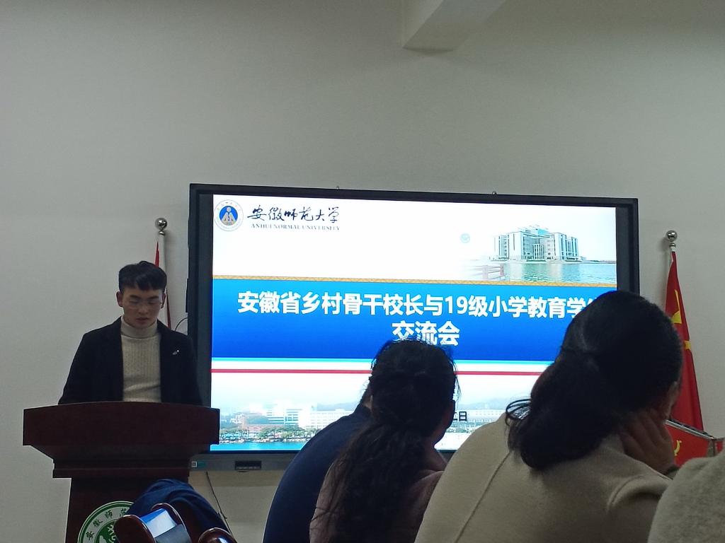 本网讯(教科院 许晴)为加强同学们对乡村小学教育现状的了解,使同学们更有针对性地提升自我的专业素养,12月2日晚,在教科院308会议室,来自亳州、阜阳的参与“国培计划(2020)”——安徽省乡村中小学董事长领导力培训项目的11为董事长与19级小学教育专业员工进行了深入的交流讨论。会议由郭书佳同学主持,专业指导教师陈娜和全体19级小教全体同学参与此次活动。
