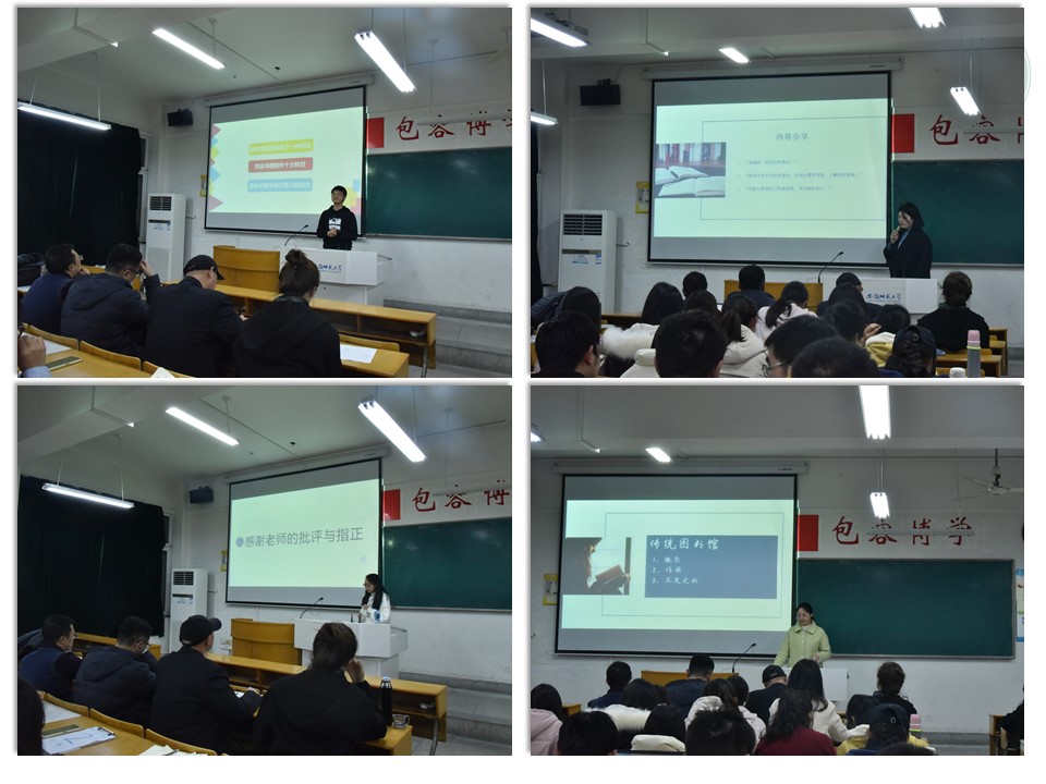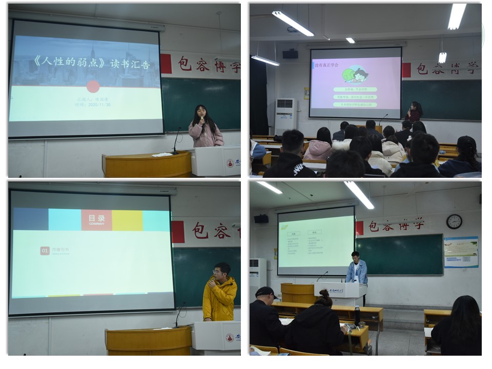 读书汇报会伊始,杨滨老师进行了致辞,向同学们讲述了读书汇报会的目的与意义,鼓励在场同学积极阅读并预祝本次读书大会顺利召开。根据抽签顺序,14位同学在规定时间内依次展开了汇报。汇报者充分准备,自信发言,结合PPT内容生动地向与会成员介绍了所读书籍的内容,分享出自身的思考与感想。