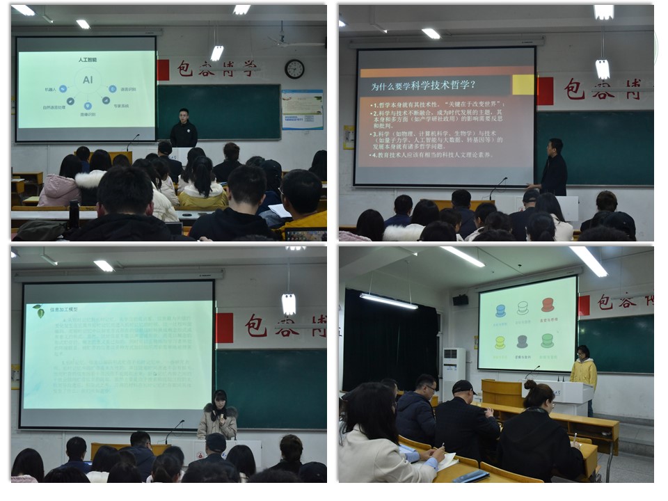 同学们的汇报主题丰富多彩,各具特色。有结合当今最新技术看待教育的新思考,也有人工智能、智慧课堂、第四次教育革命对教育影响,展望未来人工智能对教育的影响;有讲述《人性的弱点》、思考方法的《六顶思考帽》和《思维导读》带给自身的感悟;有介绍经典的学习过程之信息加工模型,也有以“为未知而教,为未来而学”的探讨,既有科学技术的哲学观点,也有智慧图书馆展望,各种新鲜的观点激发了同学们的探究兴趣,前沿科技引人联想。每一位汇报同学汇报完毕后,评委老师与现场同学结合汇报内容对汇报者进行了有针对性的提问,汇报者结合书中内容和自己的思考解答,评委老师给予适当的指正于补充。在全体指导老师与同学们的共同努力下,整场汇报秩序井然,高效充实。