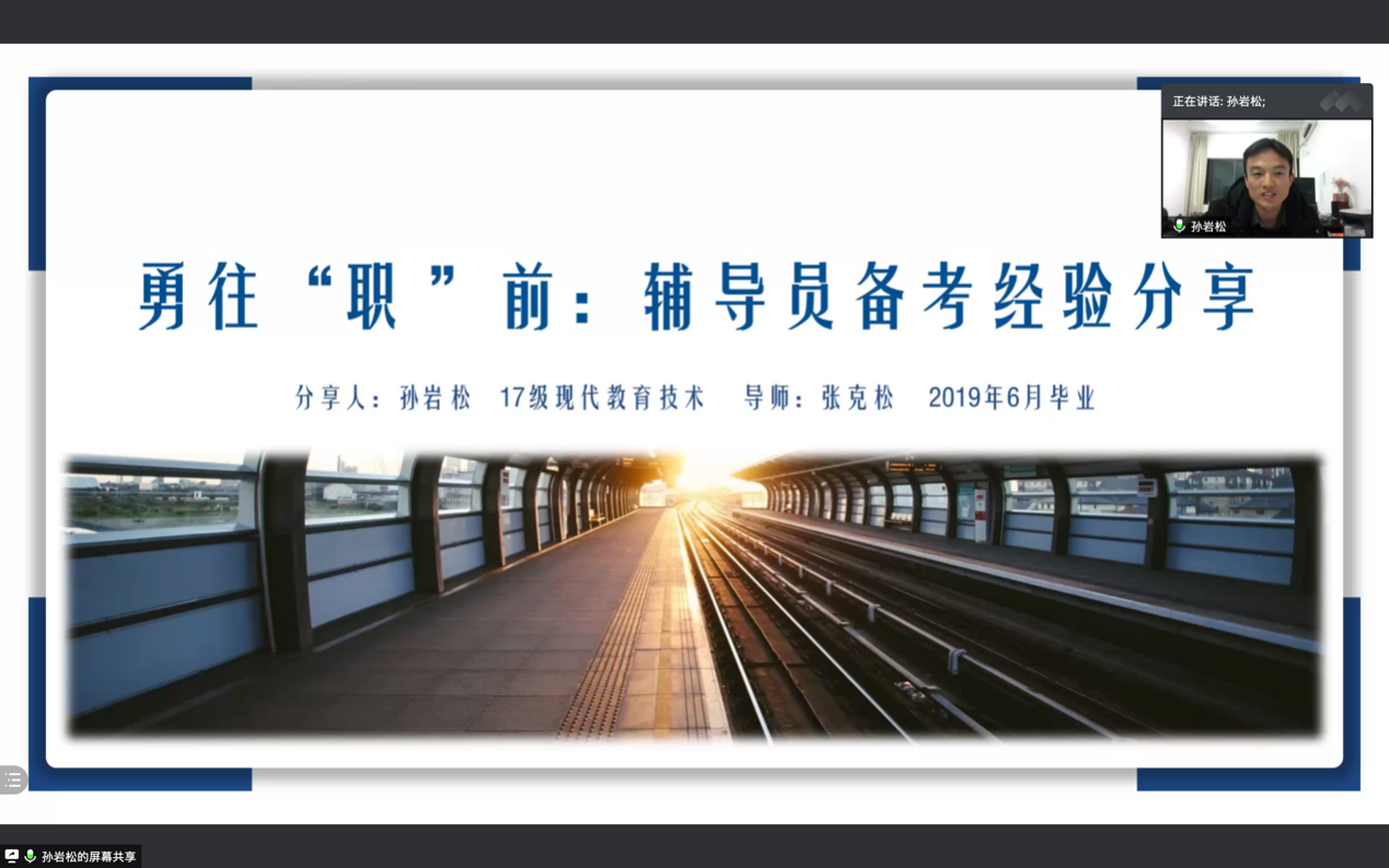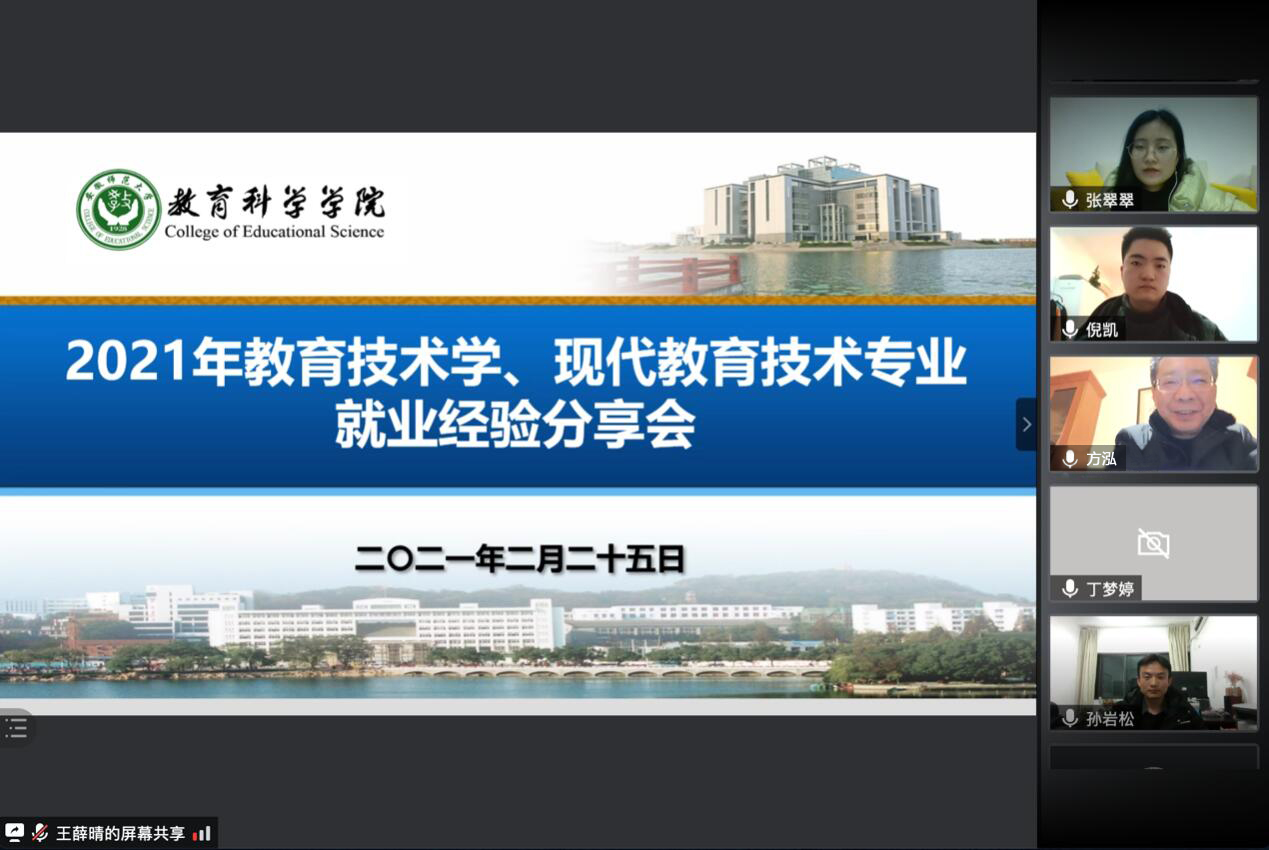 本网讯(文/何玉琪 图/何玉琪)2月25日晚上7点公司举办了2021届教育技术学、现代教育技术专业就业经验分享会。学公司党委书记方泓、研究生管理办公室叶方舟老师参加了此次分享会,活动由公司研究生会员工部成员昝雨晴主持,近百名硕士研究生在线参与交流学习。