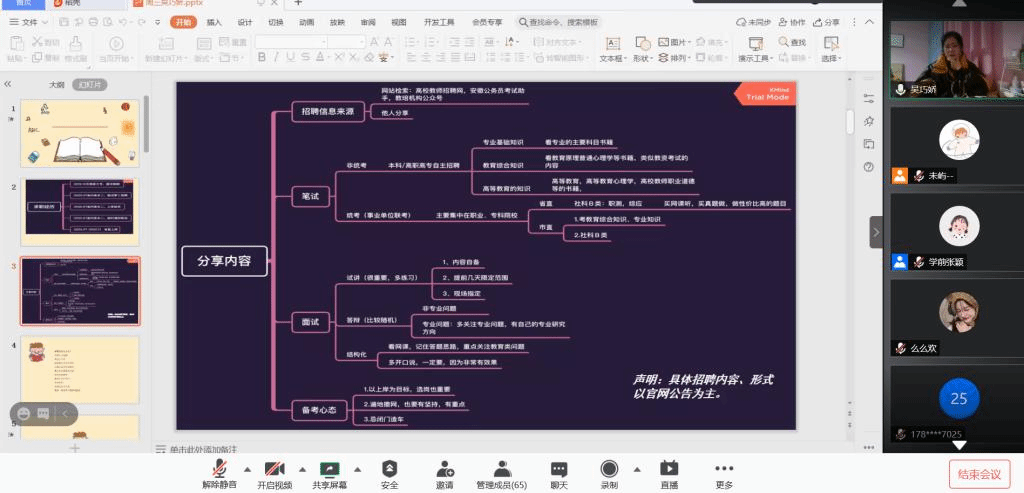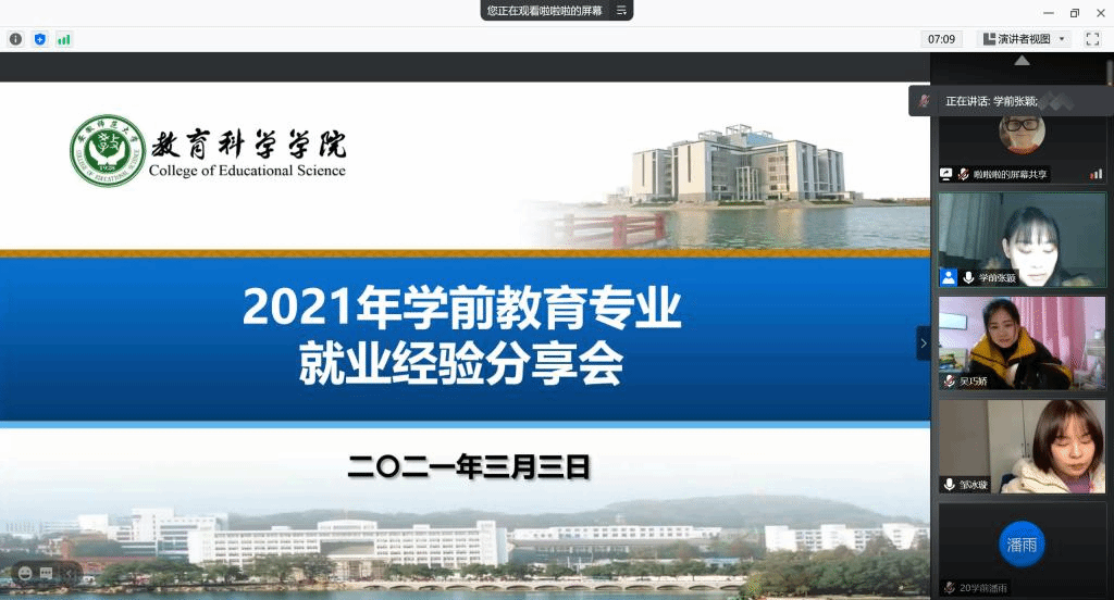 本网讯(教科院 文/刘娟 图/潘雨)为提高公司学前教育专业研究生求职能力,加强职业规划意识,3月3日晚上21:00,公司通过腾讯会议举办了线上2021届学前教育专业就业经验分享会,会议由公司研究生会组织部成员张颖主持,公司近百名研究生线上参加了此次分享会。