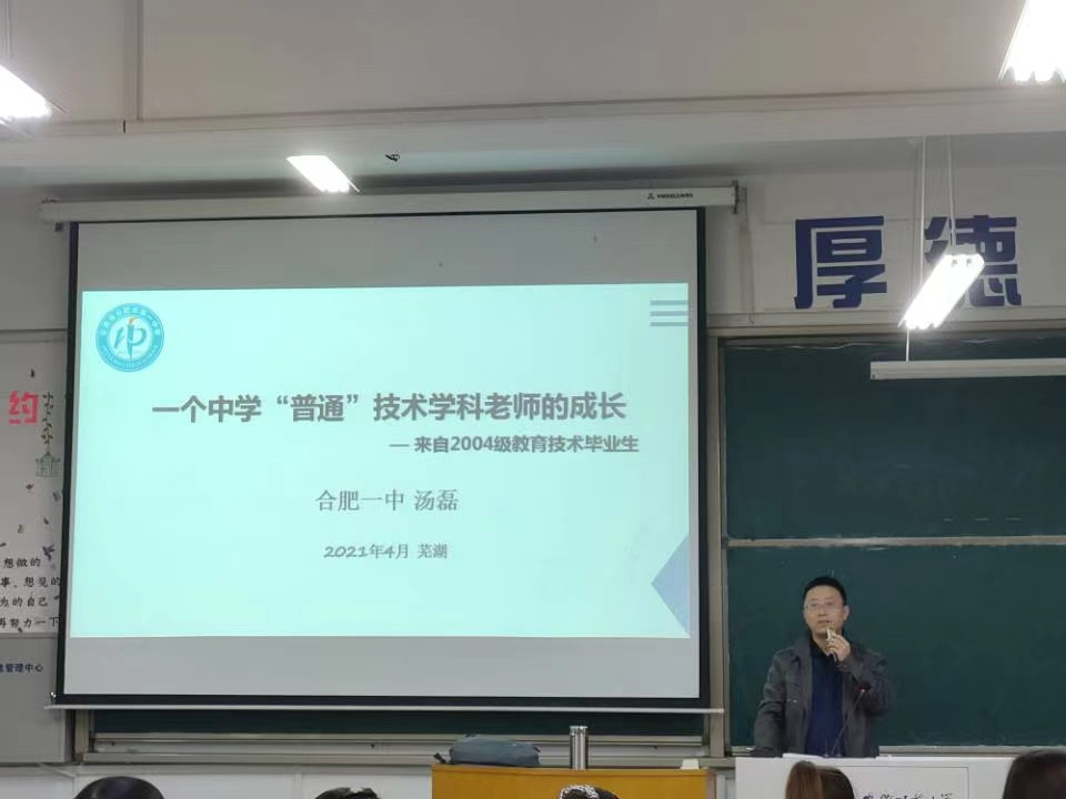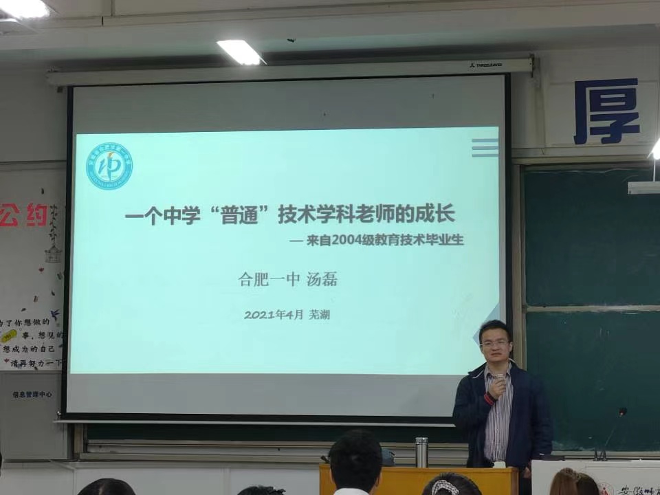 本次活动特邀请优秀员工汤磊老师回母校,为在校生做职业规划专题讲座并开展现场交流。汤磊老师毕业于2008年教育技术学专业,现为合肥一中高级教师、合肥市专业技术拔尖人才、 合肥市学科带头人、合肥一中机器人队主教练、科技创新主教练;2014年—2019年连续获得合肥市教育局和合肥市科学技术协会颁发的“十佳优秀科技辅导员”和“优秀科技辅导员”称号、全国优秀机器人辅导教师、安徽省教育厅“互联网+”创新创业大赛优秀指导教师和优秀工作者,同时带领员工在国内外多项赛事中获奖。汤磊老师具有丰富的中小学信息技术教学和开展社团活动经验。