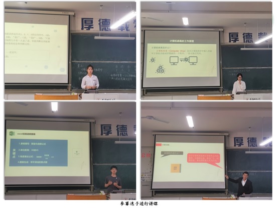 为体现师范生专业能力,提升员工专业素养,本次比赛采用说课(5分钟)和无生授课(15分钟)两种方式进行,9位参赛选手按照赛前抽签顺序依次上场。说课过程中,同学们分别从教材、学情、教法、学法、教学用具、教学过程六个方面熟练、生动地阐述了自己对一节课的理解与设计。讲课环节,各位选手亦是准备充分,目标明确,思路清晰,设计了提问、讨论、答疑等多种课堂活动,充分运用图片、视频、幻灯片等有趣的教学材料,呈现出一节节各具特色的信息技术课程。同学们流畅精炼的语言,优美整洁的板书,端庄大方的仪态,赢得了在场观众与评委老师的阵阵掌声,展现出未来教师的优秀风采。