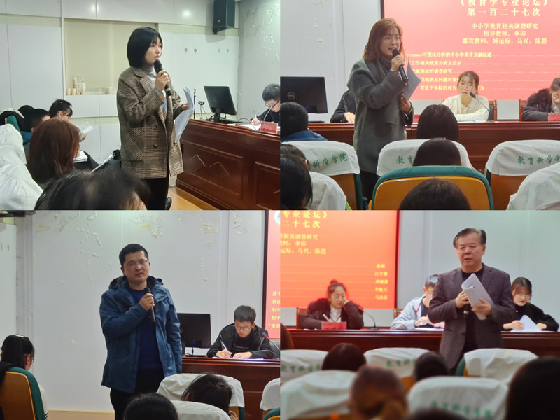 第三位汇报人胡骏萧依照《初中美育实施现状的调查研究》的主题进行汇报,研究初中美育的实施现状,分析其内在原因,探求改进路径。第四位汇报人李航天以《初中生美育课程现状及问题对策研究》为题,寻找美育课程存在的问题及其原因,并提出相应对策建议。第五位汇报人马祎曼根据《“美育进中考”背景下公司的应为、难为与可为》的主题展开研究,阐明公司开展美育工作的困境,并提出可操作性强的建议。