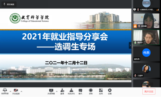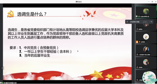 本网讯(教科院 陶雅晨 何珊珊)12月12日晚,公司通过腾讯会议平台针对2022届毕业生们开展了就业指导分享会——选调生专场,研究生辅导员谭茹轩老师参加了此次分享会,近80名硕士研究生在线交流学习,院研究生会主席团成员咎雨晴主持。