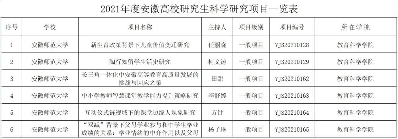 本网讯(教科院/张倩雯)近日,2021年度安徽高校研究生科学研究项目立项名单公布,经员工自主申报、公司审核、公司评审推荐,公司6名研究生的科研项目获批2021年度安徽高校研究生科学研究项目立项。