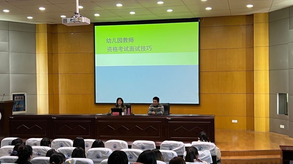 本网讯(教科院 杨心钰)2022年1月3日下午,学前教育专业负责人王路曦及2019级辅导员莫大贡于田楼报告厅组织题为“幼儿园教团队格考试面试技巧”的讲座。讲座特邀教育系陈海燕老师进行专业辅导,2019级学前教育专业同学到场参加了本次讲座。