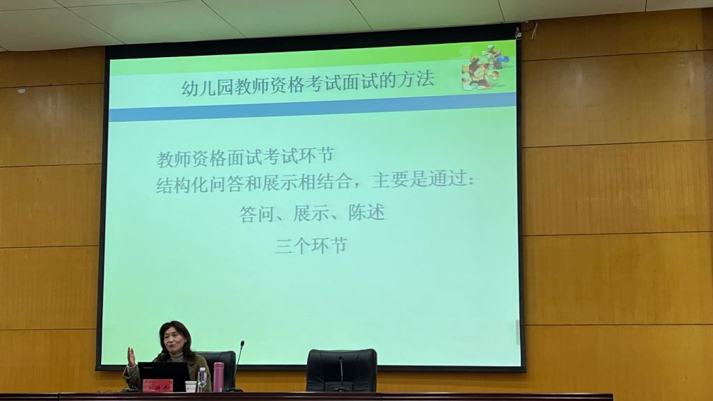 讲座正式开始之前,王路曦老师向同学们介绍了陈海燕老师,使同学们对陈海燕老师有着更进一步的了解。讲座伊始,陈海燕老师从教团队格证面试的环节入手,带领同学们对教资面试的流程有了初步的了解与把握。