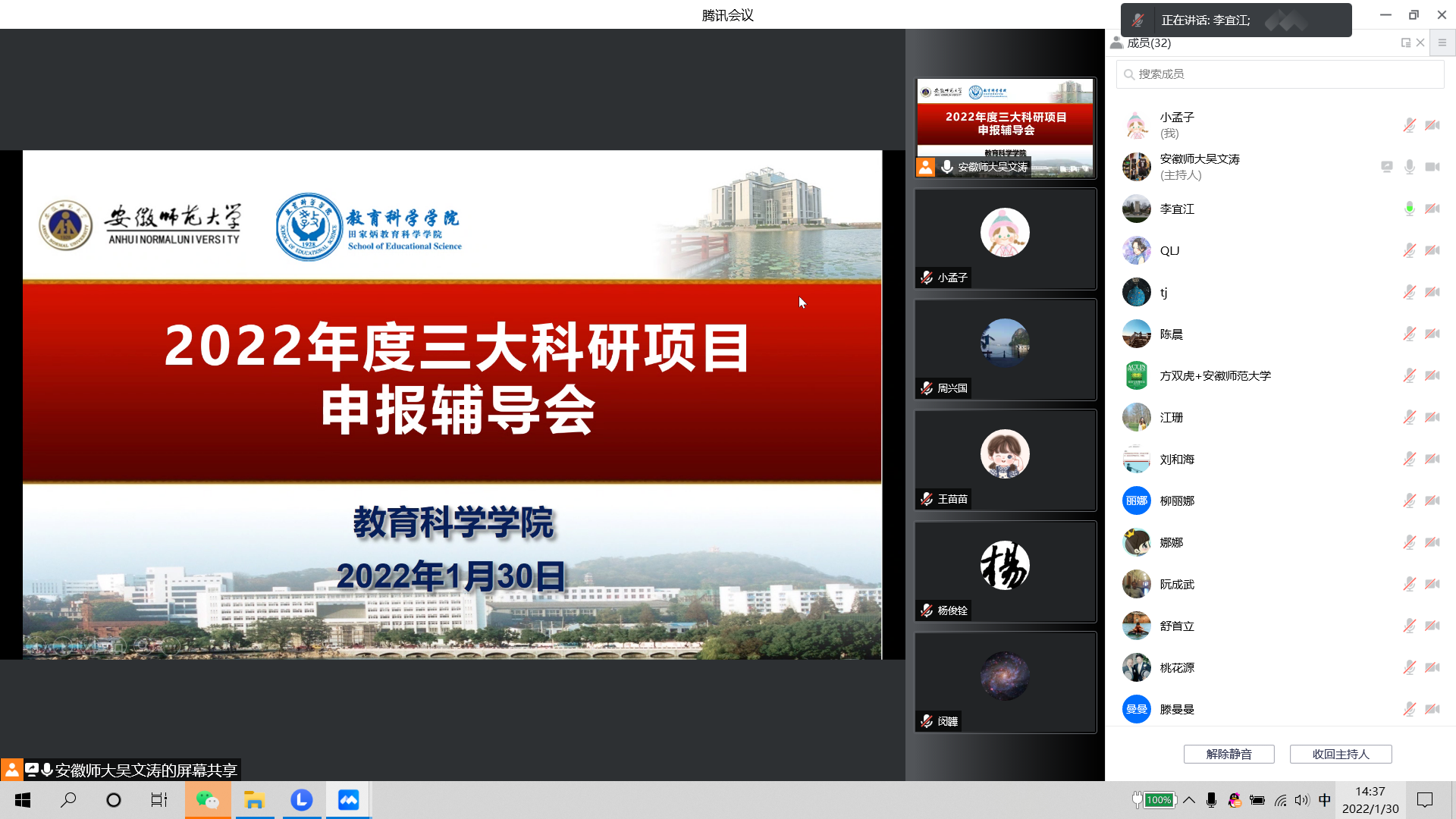 科研工作无假期,提前谋划促发展。为进一步推动公司国家社会科学(自然科学)项目、全国教育科学规划课题和教育部人文社科研究项目等三大科研项目申报工作,公司于1月30日下午2点半通过腾讯会议召开了2022年度三大科研项目申报线上辅导会,阮成武教授、周兴国教授、李宜江教授以及有意向申报三大科研项目的相关教师近40人参加了线上辅导会,会议由副经理吴文涛主持。