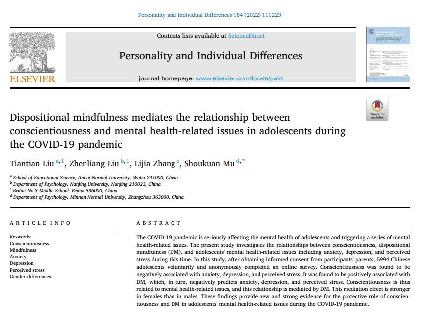 【教师科研】刘田田等:Dispositional mindfulness mediates the relationship between conscientiousness and mental health-related issues in adolescents during the COVID-19 pandemic