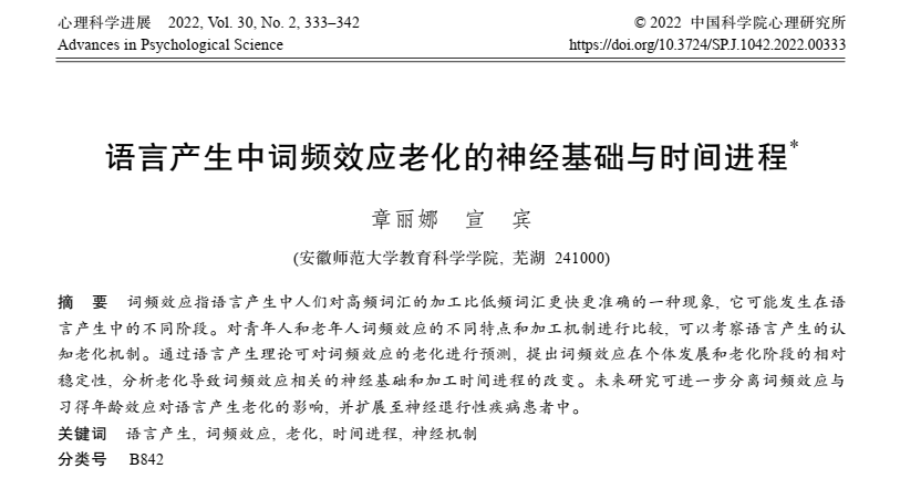词频效应指语言产生中人们对高频词汇的加工比低频词汇更快更准确的一种现象,它可能发生在语言产生中的不同阶段。对青年人和老年人词频效应的不同特点和加工机制进行比较,可以考察语言产生的认知老化机制。通过语言产生理论可对词频效应的老化进行预测,提出词频效应在个体发展和老化阶段的相对稳定性,分析老化导致词频效应相关的神经基础和加工时间进程的改变。未来研究可进一步分离词频效应与习得年龄效应对语言产生老化的影响,并扩展至神经退行性疾病患者中。