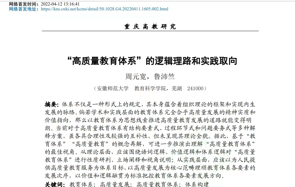 体系不仅是一种形式上的规定,其本身蕴含着组织理论的框架和实现内生 发展的脉络。倘若学术和实践层面的教育体系完全合乎高质量发展的精神实质和价值指向,那么以教育体系为思想线索推进高质量教育发展的道路就能变得明朗。当前对于高质量教育体系有结构要素式、过程环节式和问题要务式等多种解释方案,虽各具合理性及较强的互补性,但未呈现其理论全貌。据此,基于“教育体系”“高质量教育”的概念再解,可进一步推演出理解“高质量教育体系”的最佳视角。从理论层面,应该围绕语词逻辑、价值逻辑和体系逻辑对“高质量教育体系”进行性质研判、立场阐释和视角说明;从实践层面,应该以为人民提供高质量教育服务为体系目标,以高质量发展为核心范畴理顺教育体系各要素的发展次序,以价值和逻辑融贯为标准把控教育体系各要素发展方向。