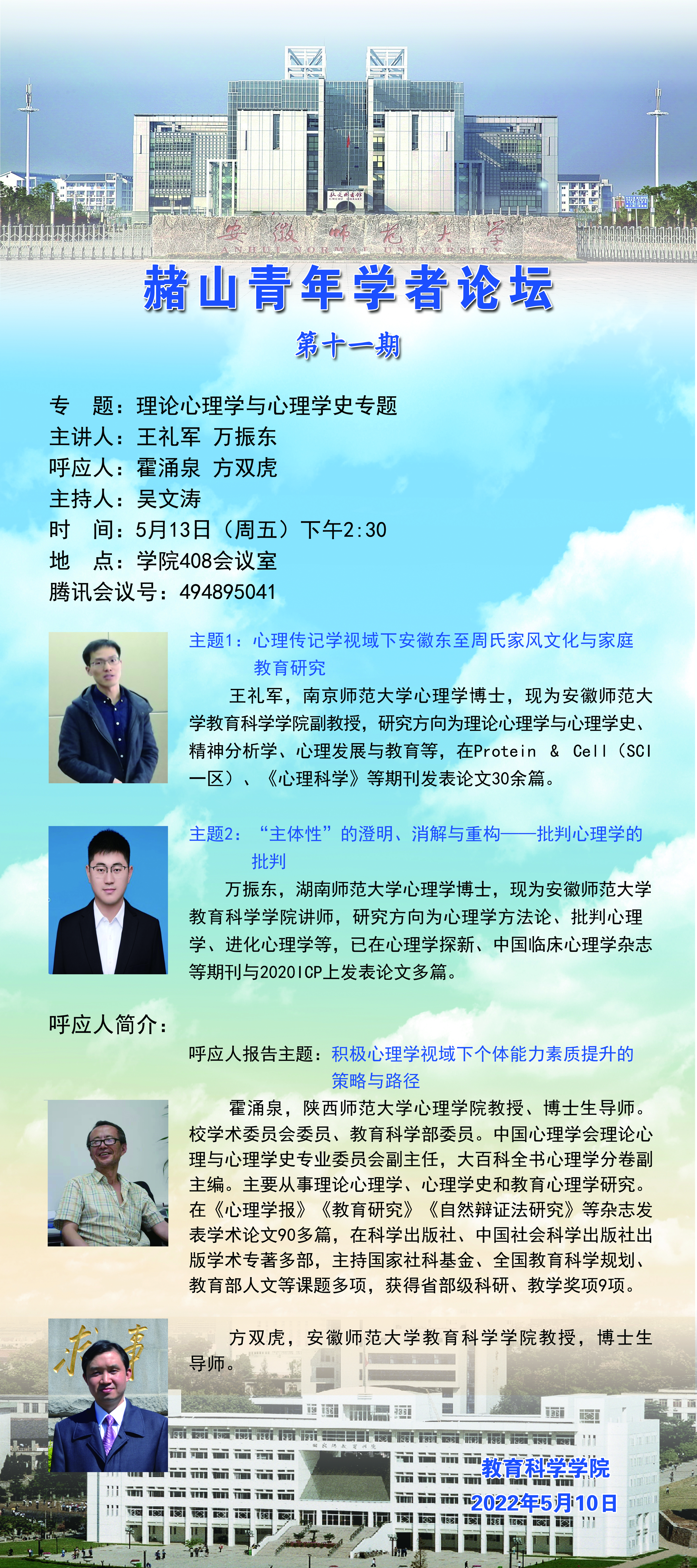 【学术预告】赭山青年学者论坛第十一期:理论心理学与心理学史专题