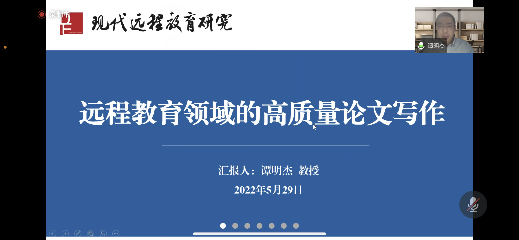 5月29日下午,四川开放大学科研处副处长谭明杰教授应邀与公司师生开展线上学术交流,并作了题目为“远程教育领域的高质量论文写作”的学术报告。本次学术报告通过腾讯会议线上举行,由聂竹明教授主持,全体教育技术学和现代教育技术专业硕士研究生线上参会。