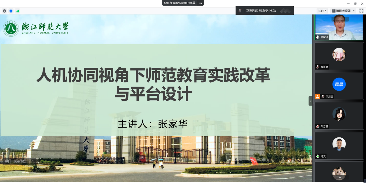 5月23日下午,浙江师范大学教师教育公司教育技术系主任张家华副教授应邀与公司师生开展线上学术交流,并作了题为《人机协同视角下师范教育实践改革与平台设计》的专题讲座。讲座通过腾讯会议举行,由公司教育技术系主任肖文主持,全体教育技术学、现代教育技术专业硕士研究生线上参会。