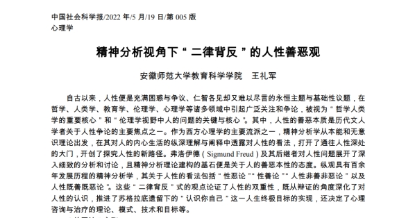 自古以来,人性便是充满困惑与争议、仁智各见却又难以尽言的永恒主题与基础性议题,在哲学、人类学、教育学、伦理学、心理学等诸多领域中引起广泛关注和争论,被视为“哲学人类学的重要核心”和“伦理学视野中人的问题的关键与核心”。其中,人性的善恶本质是历代文人学者关于人性争论的主要焦点之一。作为西方心理学的主要流派之一,精神分析学从本能和无意识理论出发,在其对人的内心生活的纵深理解与阐释中透露对人性的看法,打开了通往人性深处的大门,开创了探究人性的新路径。弗洛伊德(Sigmund Freud)及其后继者对人性问题展开了深入细致的分析和讨论,且精神分析理论建构的基石便是关于人的善恶本性的态度。纵观具有百余年发展历程的精神分析学,其关于人性的看法包括“性恶论”“性善论”“人性非善非恶论”以及人性既善既恶论”。这些“二律背反”式的观点论证了人性的双重性,既从辩证的角度深化了对人性的认识,推进了苏格拉底遗留下的“认识你自己”这一人生终极目标的实现,还决定了心理咨询与治疗的理论、模式、技术和目标等。
