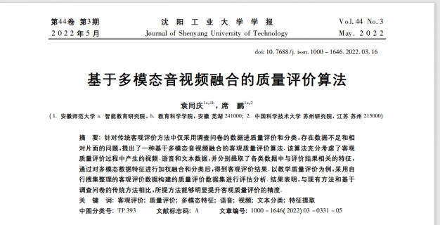 针对传统客观评价方法中仅采用调查问卷的数据进质量评价和分类,存在数据不足和相对片面的问题,提出了一种基于多模态音视频融合的客观质量评价算法。该算法充分考虑了客观质量评价过程中产生的视频、语音和文本数据,并分别提取了各类数据中与评价结果相关的特征,通过对多模态数据特征进行加权融合和分类后,得到客观评价结果。以教学质量评价为例,采用自行搜集整理的客观评价数据构建的质量评价数据集进行评估分析。结果表明,与现有方法和基于调查问卷的传统方法相比,所提方法能够明显提升客观质量评价的精度。