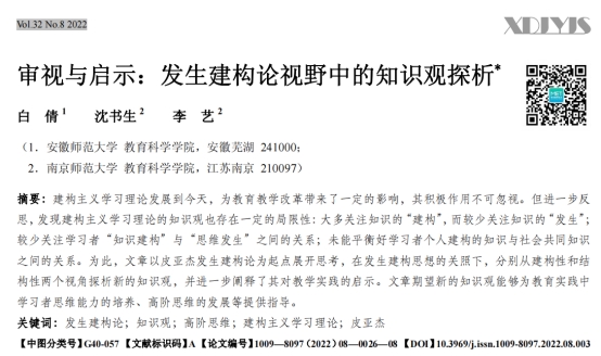 建构主义学习理论发展到今天,为公司产品改革带来了一定的影响,其积极作用不可忽视。但进一步反思,发现建构主义学习理论的知识观也存在一定的局限性:大多关注知识的“建构”,而较少关注知识的“发生”;较少关注学习者“知识建构”与“思维发生”之间的关系;未能平衡好学习者个人建构的知识与社会共同知识之间的关系。为此,文章以皮亚杰发生建构论为起点展开思考,在发生建构思想的关照下,分别从建构性和结构性两个视角探析新的知识观,并进一步阐释了其对教学实践的启示。文章期望新的知识观能够为教育实践中学习者思维能力的培养、高阶思维的发展等提供指导。